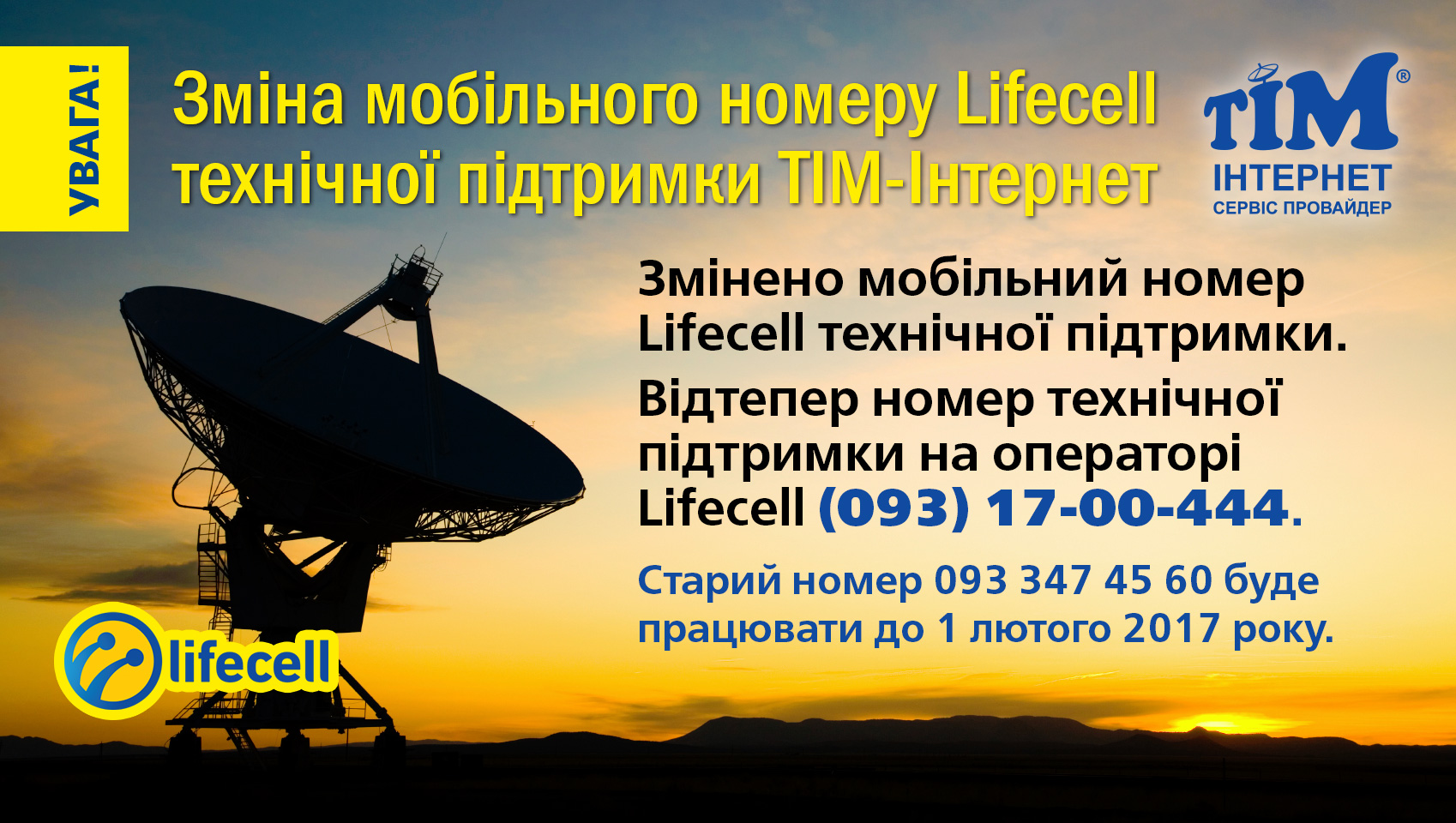 УВАГА!!! Змінено мобільний номер Lifecell технічної підтримки. Відтепер номер технічної підтримки на операторі Lifecell 0931700444. Старий номер 093 347 45 60 буде працювати до 1 лютого 2017 року.