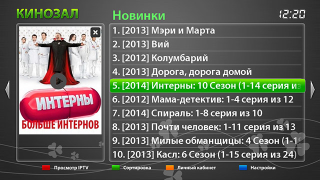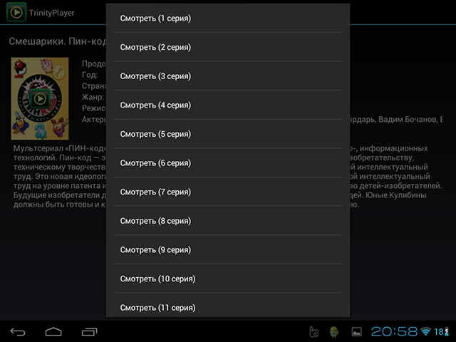 Кроме телевидения плеер предлагает доступ к архиву кино ссылок, содержащем описание фильмов с возможностью их просмотра. Внешний вид каталога с описанием информации по фильмам показан на рисунке.