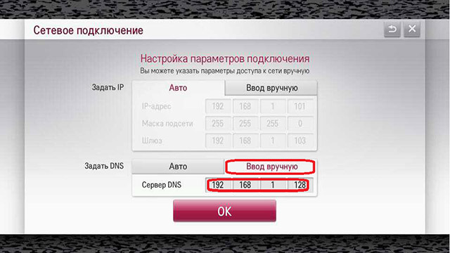 Выбрать пункт Расширенные настройки В зависимости от типа, которым Вы подключили телевизор к Интернету выбрать нужный Тип подключения В открывшемся меню задать адрес DNS сервера 178.209.65.67 Для этого необходимо переключить кнопку Ввод вручную, ввести адрес сервера DNS 178.209.65.67, нажать ОК для сохранения изменений. Обратите внимание: рисунок ниже приведен для наглядности и в строку адреса Вам необходимо ввести адрес DNS 178.209.65.67!!!