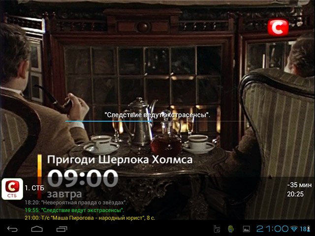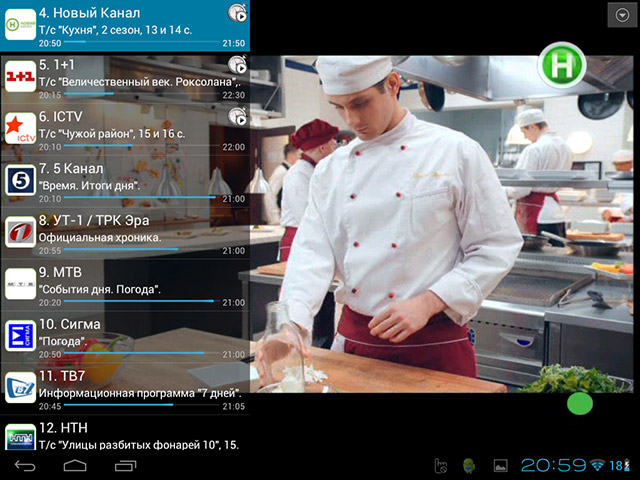 В полноэкранном режиме переключение каналов возможно с помощью операции Swipe вверх или вниз от центра экрана. При этом доступна телепрограмма на текущие и прошедшие программы, а также временной индикатор.