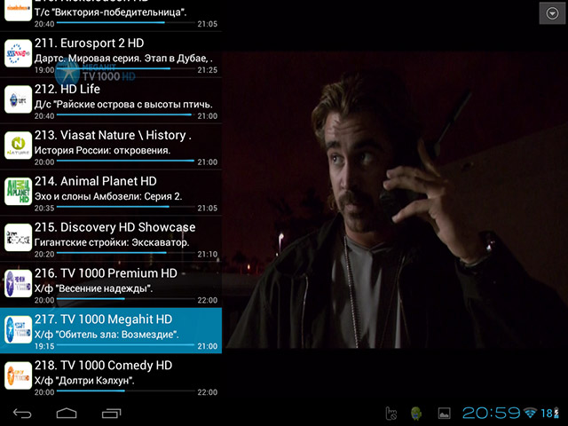 Внешний вид Android IPTV плеера показан на скриншоте. Левая панель, содержащая список каналов, показывается и скрывается по однократному "тапу" по экрану.
