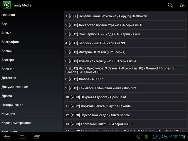 Каталог содержит ссылки на фильмы расположенные на внешних видео ресурсах в Интернете и для их воспроизведения используется "внешний" плеер - MX Player, который должен быть установлен на вашем устройстве для просмотра киноархива.