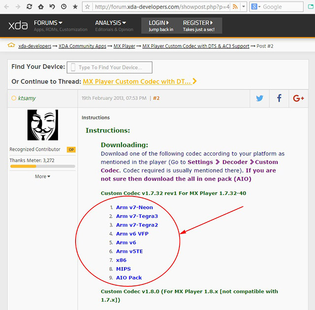 2. Теперь в веб-браузере заходим на сайт: http://forum.xda-developers.com/showpost.php?p=46190935&postcount=2 В соответствии с обозначенным кодеком - производим выбор для скачивания. Установка кодека, по сути, происходит двумя способами: